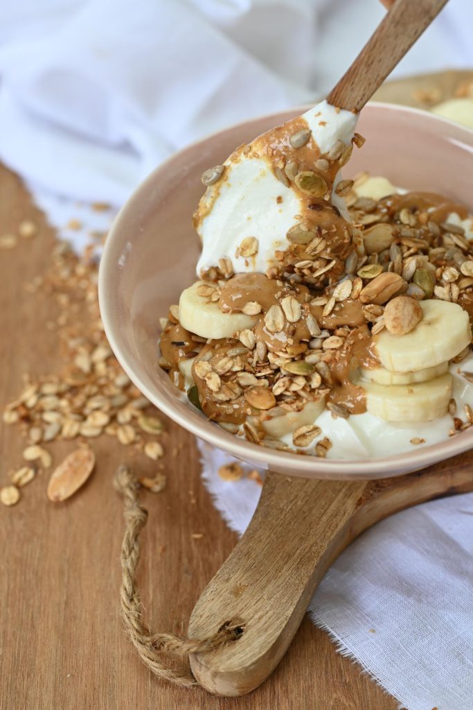 - Strooi de granola erbij en verdeel de pindakaas eroverheen.